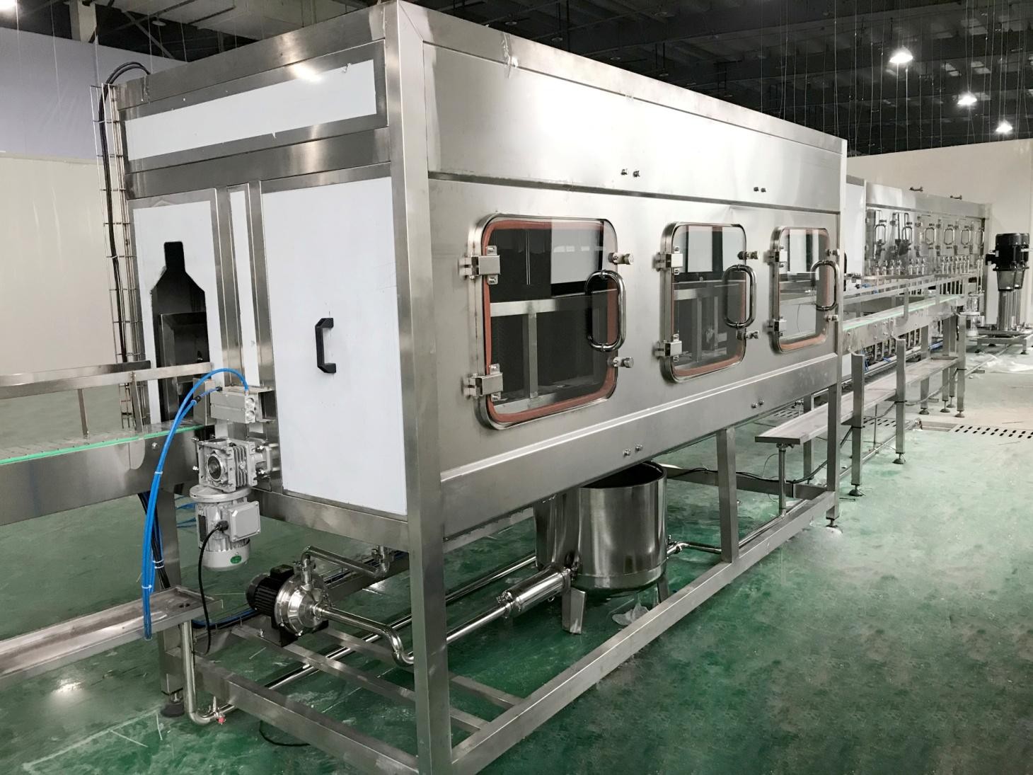 Designed to rinse and sterilize the outer surface of the returned gallon bottles, ensuring hygienic conditions before entering the filling area.